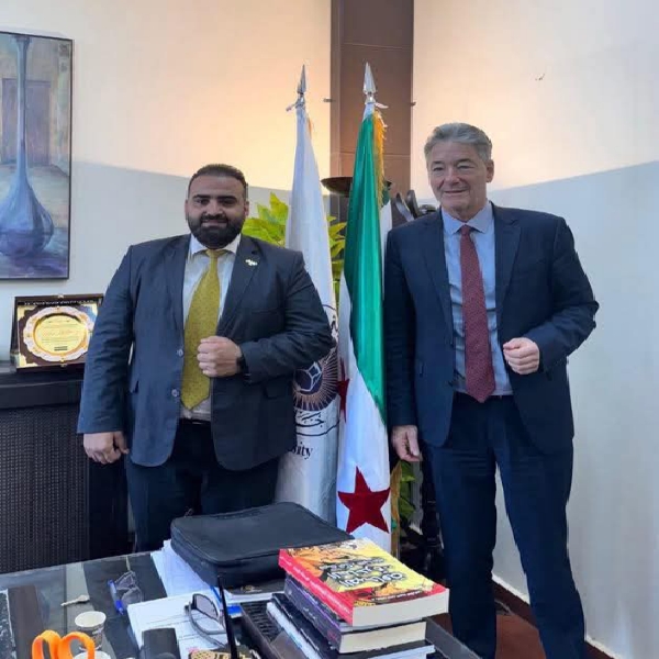 بحث عميد كلية الاعلام في جامعة دمشق الدكتور خالد زعرور مع السيد مايكل أونماخت رئيس بعثة الاتحاد الأوروبي لسوريا سبل تعزيز التعاون المشترك بين الكلية والاتحاد.