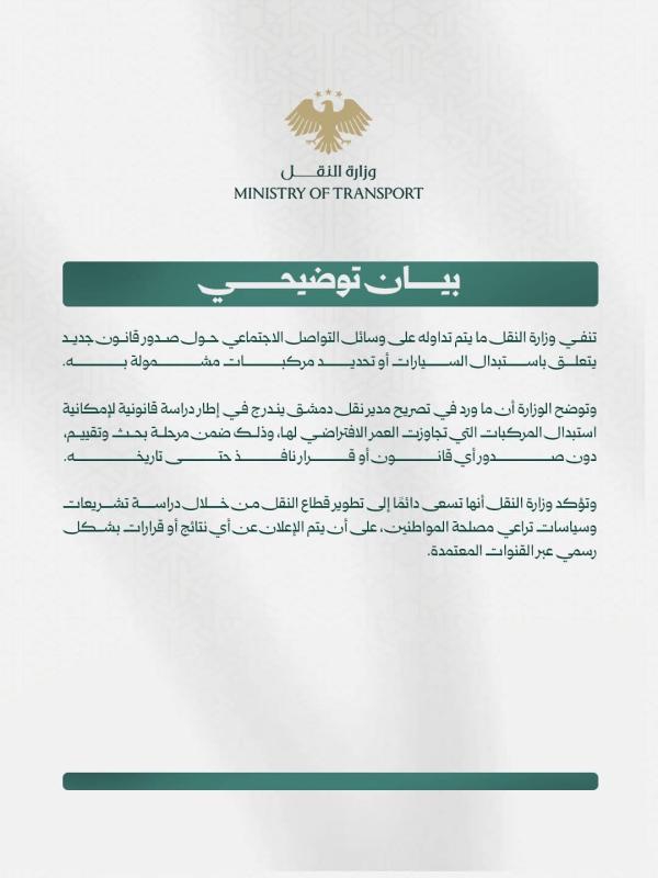 نفت وزارة النقل ما يتم تداوله على وسائل التواصل الاجتماعي حول صدور قانون جديد يتعلق باستبدال السيارات