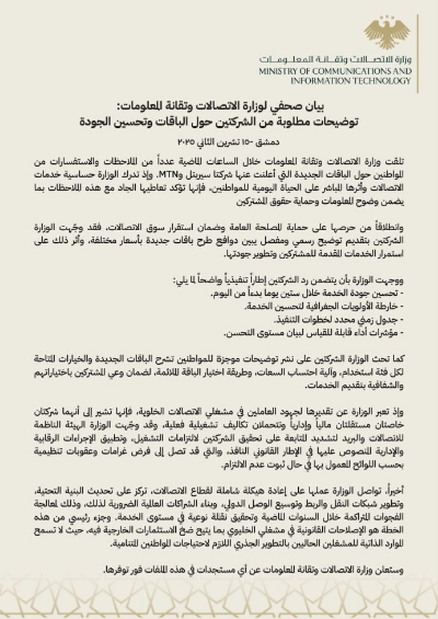 طالبت وزارة الاتصالات وتقانة المعلومات في سوريا، شركتي سيريتل و"MTN" بتقديم توضيح رسمي ومفصل حول الباقات الجديدة التي أعلنتا عنها، موضحة دوافع طرحها وأسعارها المختلفة، وأثر ذلك على جودة الخدمات المقدمة للمشتركين واستمراريتها.